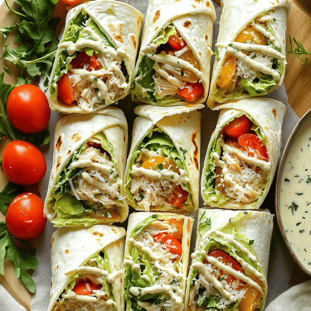 Für die Präsentation lege ich die Wraps auf eine große Platte. Ich stelle eine kleine Schüssel mit extra Caesar-Dressing zum Dippen daneben. Das sieht nicht nur toll aus, sondern macht auch Spaß. Um die Wraps noch schöner zu machen, garniere ich sie mit einem Hauch Parmesan und frischen Kräutern. Diese kleinen Details bringen Farbe und Frische.
