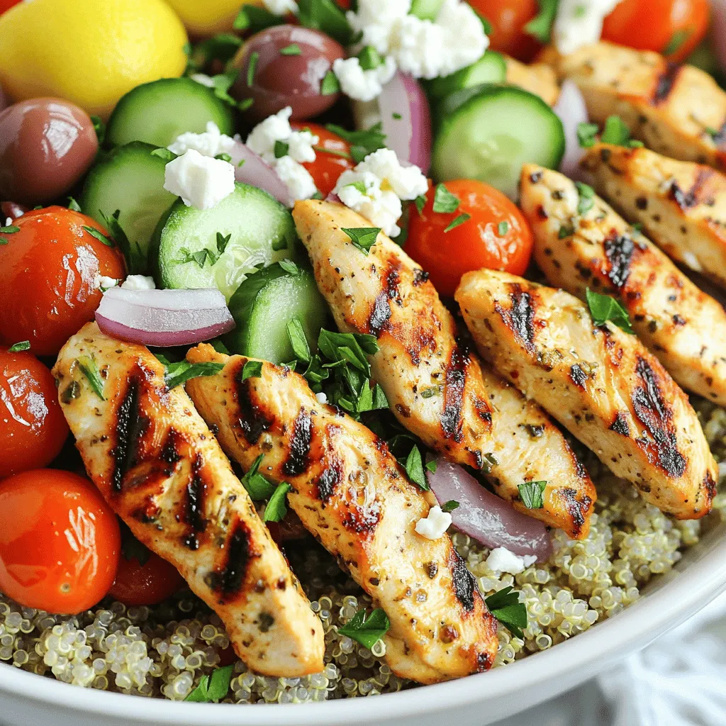 ![Für meine Easy Greek Chicken Bowls benötigst du folgende Zutaten: - 2 Hähnchenbrustfilets, ohne Knochen und Haut - 2 Esslöffel Olivenöl - 2 Teelöffel getrockneter Oregano - 1 Teelöffel Knoblauchpulver - Salz und Pfeffer nach Geschmack - 1 Tasse gekochte Quinoa oder Naturreis - 1 Tasse Kirschtomaten, halbiert - 1 Gurke, gewürfelt - 1/2 rote Zwiebel, dünn geschnitten - 1 Tasse Feta-Käse, zerbröckelt - 1/4 Tasse Kalamata-Oliven, entsteint und in Scheiben geschnitten - Saft von 1 Zitrone - Frische Petersilie zum Garnieren Frische Kräuter bringen oft einen kräftigen Geschmack. Sie sind ideal, um die Aromen zu heben. Getrocknete Kräuter sind jedoch praktisch. Sie sind länger haltbar und haben einen konzentrierten Geschmack. In diesem Rezept verwende ich getrockneten Oregano. Er passt gut zu Hähnchen und bringt die Aromen zusammen. Wenn du frische Kräuter hast, kannst du diese gerne verwenden. Frischer Oregano oder Petersilie gibt einen tollen Kick. Guter Feta-Käse macht einen großen Unterschied. Achte darauf, dass der Käse aus Schafsmilch ist. Er hat einen reicheren Geschmack. Schau nach Käse, der in Lake eingelegt ist. Das hält ihn frisch und saftig. Geriebener oder zerbröckelter Feta kann leicht austrocknen. Wenn du ihn frisch kaufst, kannst du ihn selbst zerbröckeln. Das gibt dir eine bessere Textur in deinen Bowls. Die Marinade macht den Unterschied. Beginne mit einer Schüssel. Füge 2 Esslöffel Olivenöl hinzu. Dann kommen 2 Teelöffel getrockneter Oregano. Gib 1 Teelöffel Knoblauchpulver dazu. Vergiss nicht, Salz und Pfeffer nach Geschmack hinzuzufügen. Vermenge alles gut und streiche die Marinade gleichmäßig auf die Hähnchenbrustfilets. Lass sie 10-15 Minuten ruhen. So ziehen die Aromen ein und das Hähnchen wird zart. Heize deinen Grill oder eine Grillpfanne auf mittelhohe Hitze vor. Das Hähnchen sollte für etwa 6-7 Minuten auf jeder Seite grillen. Achte darauf, dass die Innentemperatur bei 75°C liegt. Das sorgt dafür, dass das Hähnchen gut durchgegart ist. Nimm das Hähnchen vom Grill und lass es einige Minuten ruhen. Danach schneide es in schmale Streifen. So bleibt der Saft im Fleisch. Beginne mit einer Basis aus 1 Tasse gekochter Quinoa oder Naturreis. Gib dann die gegrillten Hähnchenstreifen darauf. Füge Kirschtomaten, Gurke und rote Zwiebel hinzu. Streue 1 Tasse zerbröckelten Feta-Käse und 1/4 Tasse Kalamata-Oliven über die Zutaten. Das sieht nicht nur gut aus, sondern schmeckt auch frisch und lecker. Zum Schluss träufle den Saft von 1 Zitrone über die Bowl und garniere sie mit frischer Petersilie. So sieht deine Bowl einladend aus und schmeckt köstlich. Schau dir auch das [Full Recipe] für mehr Details an. Um dein Hähnchen zu marinieren, mische Olivenöl, Oregano, Knoblauchpulver, Salz und Pfeffer. Diese Mischung gibt dem Hähnchen einen tollen Geschmack. Bestreiche die Hähnchenbrustfilets gleichmäßig mit der Marinade. Lasse sie dann für 10 bis 15 Minuten ruhen. So ziehen die Aromen gut ein. Du kannst auch die Marinade einen Tag vorher ansetzen. Das macht das Hähnchen noch schmackhafter. Um Zeit zu sparen, bereite deine Zutaten vorher vor. Schneide die Kirschtomaten, Gurken und Zwiebeln im Voraus. Bewahre sie in einem luftdichten Behälter im Kühlschrank auf. Koche auch die Quinoa oder den Reis einen Tag vorher. So hast du mehr Zeit, das Hähnchen zu grillen und deine Bowls zusammenzustellen. Für eine schöne Präsentation wähle bunte Schalen. Mische die Zutaten in Schichten. Beginne mit Quinoa oder Reis, gefolgt von Hähnchen, Gemüse und Feta-Käse. Ein Spritzer Zitronensaft vor dem Servieren macht das Gericht frisch und einladend. Du kannst auch frische Petersilie oben drauf legen. So siehst du gleich, dass die Bowls lecker und gesund sind. Für das gesamte Rezept, schau dir die [Full Recipe] an. {{image_4}} Wenn du die griechischen Hähnchen-Bowls ohne Fleisch magst, gibt es tolle Optionen. Du kannst gegrillte Auberginen oder Zucchini verwenden. Diese bringen eine schöne Textur und Geschmack. Tofu oder Tempeh sind auch gute Alternativen. Mariniere sie wie das Hähnchen, um den Geschmack zu intensivieren. Verwende auch Kichererbsen für eine proteinreiche Option. Sie passen gut zu den Aromen der Bowl. Die Bowls sind sehr vielseitig. Du kannst viele Zutaten hinzufügen. Gegrillte Paprika bringt Süße. Avocado fügt Cremigkeit hinzu. Für mehr Crunch kannst du Karotten oder Radieschen hinzufügen. Auch frische Kräuter wie Minze oder Dill machen die Bowls lebendig. Nüsse wie Pistazien oder Mandeln sind tolle Knusper-Elemente. Diese Zutaten geben deinen Bowls mehr Tiefe und Geschmack. Wenn du bestimmte diätetische Bedürfnisse hast, kannst du die Bowls leicht anpassen. Für glutenfreie Optionen kannst du Quinoa oder Reis verwenden. Wenn du auf Laktose achtest, lasse den Feta-Käse weg oder wähle eine laktosefreie Variante. Für eine kalorienärmere Version kannst du die Menge an Olivenöl reduzieren. Denke daran, frisches Gemüse zu nutzen, um die Nährstoffe zu erhöhen. Die Kombination von Aromen und Texturen macht diese Bowls besonders. Sie sind nicht nur lecker, sondern auch gesund. Du kannst die Bowls nach deinem Geschmack gestalten. Wenn du mehr Ideen benötigst, schaue dir das [Full Recipe] an. Um Ihre griechischen Hähnchen-Bowls frisch zu halten, legen Sie sie in einen luftdichten Behälter. Achten Sie darauf, dass die Schalen gut verschlossen sind. Dies hilft, die Aromen zu bewahren und das Austrocknen zu verhindern. Sie können die Bowls auch in einzelnen Portionen aufteilen. So haben Sie eine schnelle und gesunde Mahlzeit zur Hand. Die Reste Ihrer Bowls sind im Kühlschrank etwa 3 bis 4 Tage haltbar. Achten Sie darauf, die Bowls nicht länger stehen zu lassen. Wenn Sie die Bowls länger aufbewahren möchten, können Sie sie auch einfrieren. Dann halten sie bis zu 3 Monate. Denken Sie daran, sie vor dem Essen gründlich aufzutauen. Um die Bowls ohne Qualitätsverlust aufzuwärmen, verwenden Sie die Mikrowell