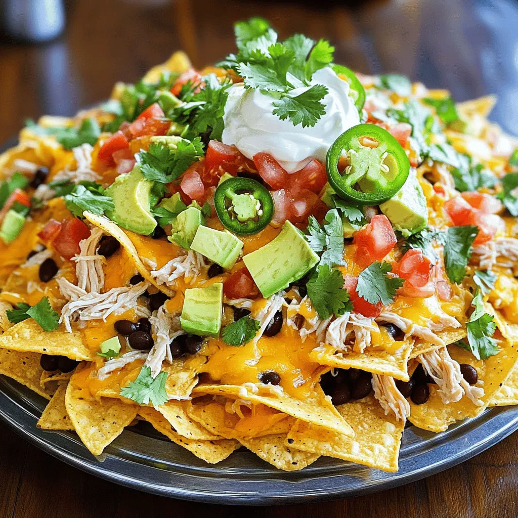 Für die Überladenen Hühner-Nachos brauchst du einige Hauptzutaten: - 2 Tassen gekochtes, zerrissenes Hühnerfleisch - 1 Tüte (340 g) Tortilla-Chips - 1 Tasse geriebener Cheddar-Käse - 1 Tasse geriebener Monterey Jack Käse - 1 Tasse schwarze Bohnen, abgespült und abgetropft - 1 Jalapeño, in dünne Scheiben geschnitten - 1 mittlere Tomate, gewürfelt - 1/4 Tasse rote Zwiebel, fein gehackt - 1/4 Tasse frischer Koriander, gehackt - 1 Avocado, gewürfelt - 1/2 Tasse Sauerrahm - 1/4 Tasse eingelegte Jalapeños (optional) - 1 Esslöffel Olivenöl - Salz und Pfeffer nach Geschmack Diese Zutaten machen deine Nachos lecker und sättigend. Um den Nachos mehr Geschmack zu geben, nutze Gewürze wie Salz und Pfeffer. Du kannst auch Paprika oder Kreuzkümmel hinzufügen. Diese Gewürze sind einfach zu finden und machen viel aus. Wenn du mehr Schärfe magst, füge eine Prise Cayennepfeffer hinzu. Du kannst auch frische Limettenscheiben als Ergänzung verwenden. Sie bringen Frische und Geschmack. Frische Zutaten sind der Schlüssel zum Erfolg. Wähle reife Tomaten und knackige Jalapeños. Achte darauf, dass der Koriander frisch aussieht und einen starken Duft hat. Die Avocado sollte leicht weich sein, aber nicht überreif. Wenn du frische, hochwertige Zutaten verwendest, schmecken die Nachos besser. Das ist wichtig für dein Geschmackserlebnis. Für das vollständige Rezept kannst du die [Full Recipe] ansehen. Um die besten Loaded Chicken Nachos zu machen, beginne mit der Vorbereitung deiner Zutaten. Du brauchst: - 2 Tassen gekochtes, zerrissenes Hühnerfleisch - 1 Tüte (340 g) Tortilla-Chips - 1 Tasse geriebener Cheddar-Käse - 1 Tasse geriebener Monterey Jack Käse - 1 Tasse schwarze Bohnen, abgespült und abgetropft - 1 Jalapeño, in dünne Scheiben geschnitten - 1 mittlere Tomate, gewürfelt - 1/4 Tasse rote Zwiebel, fein gehackt - 1/4 Tasse frischer Koriander, gehackt - 1 Avocado, gewürfelt - 1/2 Tasse Sauerrahm - 1/4 Tasse eingelegte Jalapeños (optional) - 1 Esslöffel Olivenöl - Salz und Pfeffer nach Geschmack Sorge dafür, dass alle Zutaten bereit sind. Das macht das Kochen viel einfacher. Jetzt kommt der spannende Teil: die Hühnermischung! Erhitze das Olivenöl in einer Pfanne bei mittlerer Hitze. Füge die rote Zwiebel hinzu und dünste sie. Warte etwa 3-4 Minuten, bis sie glasig ist. Dann füge das zerrissene Hühnerfleisch hinzu. Würze es mit Salz und Pfeffer. Rühre alles um, bis das Huhn heiß ist. Das dauert nur etwa 2-3 Minuten. Diese Mischung wird deine Nachos voller Geschmack machen! Der nächste Schritt ist das Schichten der Nachos. Breite die Tortilla-Chips gleichmäßig auf einem großen Backblech aus. Jetzt kommt die Hühnermischung. Verteile die Hälfte der Mischung über die Chips. Dann füge die schwarzen Bohnen, gewürfelte Tomaten, Jalapeño-Scheiben und die beiden Käsesorten hinzu. Wiederhole diesen Schritt mit den restlichen Zutaten. So erhältst du zwei leckere Schichten! Heize deinen Ofen auf 175°C (350°F) vor und backe die Nachos für 10-15 Minuten. Achte darauf, dass der Käse schön schmilzt und sprudelt. Nimm das Blech aus dem Ofen und lass die Nachos kurz abkühlen. Belege sie dann mit Avocado, Koriander und einem Klecks Sauerrahm. Wenn du einen extra Kick magst, füge eingelegte Jalapeños hinzu. Jetzt bist du bereit, deine Loaded Chicken Nachos zu genießen! Der Käse ist der Star der Nachos. Um ihn perfekt zu schmelzen, mische zwei Käsesorten. Ich empfehle Cheddar und Monterey Jack. Beide Käse schmelzen gut und bieten tollen Geschmack. Streue den Käse gleichmäßig über die Nachos. Achte darauf, dass die Chips gut bedeckt sind. So bleibt jeder Biss saftig und lecker. Backe die Nachos, bis der Käse sprudelt. Lass sie nach dem Backen kurz abkühlen. So bleibt der Käse cremig und läuft nicht vom Nacho. Zu den Nachos gibt es viele leckere Beilagen. Ich mag frischen Koriander und Avocado. Das gibt einen frischen Geschmack. Auch Sauerrahm passt gut dazu. Du kannst auch Salsa oder Guacamole servieren. Wenn du einen scharfen Kick magst, füge eingelegte Jalapeños hinzu. Diese Beilagen machen die Nachos noch besser. Wenn du Reste hast, mache etwas Neues daraus. Du kannst die Hühnermischung in Tacos verwenden. Fülle Tortillas und füge etwas Gemüse hinzu. Auch ein Auflauf ist eine tolle Idee. Schichte die Reste mit etwas Käse und backe es im Ofen. So hast du schnell ein neues Gericht. Reste können auch in Salaten gut schmecken. Sei kreativ und genieße die Vielfalt. {{image_4}} Käse macht Nachos lecker und cremig. Sie können verschiedene Käsesorten verwenden. Cheddar ist klassisch, aber Monterey Jack bringt auch einen tollen Geschmack. Gouda oder Brie können eine neue Dimension hinzufügen. Diese Käsesorten schmelzen gut und sorgen für ein reichhaltiges Aroma. Experimentieren Sie mit Käsemischungen, um Ihre perfekte Kombination zu finden. Nicht jeder isst Huhn. Für Veganer oder Vegetarier gibt es tolle Alternativen. Nutzen Sie schwarze Bohnen oder Linsen als Basis. Ersetzen Sie das Hühnerfleisch durch gewürfelte Zucchini oder Paprika. Pflanzenbasierte Käsesorten sind ebenfalls eine gute Option. Sie schmecken großartig und machen die Nachos trotzdem sättigend. Die Toppings machen die Nachos spannend. Fügen Sie frische Jalapeños für Schärfe hinzu. Guacamole gibt einen cremigen Kontrast. Salsa bringt Frische ins Spiel. Andere Möglichkeiten sind Mais, Oliven oder frische Kräuter. Saucen wie BBQ oder Chipotle können einen besonderen Kick geben. Lassen Sie Ihrer Kreativität freien Lauf und passen Sie die Nachos nach Ihrem Geschmack an. Um die Nachos gut zu lagern, lassen Sie sie zuerst abkühlen. Legen Sie sie dann in einen luftdichten Behälter. Das schützt sie vor Feuchtigkeit und hält sie frisch. Verwenden Sie ein Papiertuch zwischen den Schichten, um die Knusprigkeit zu erhalten. Wenn Sie Reste haben, können Sie diese einfach wieder aufwärmen. Vorheizen auf 175°C (350°F) ist wichtig. Legen Sie die Nachos auf ein Backblech