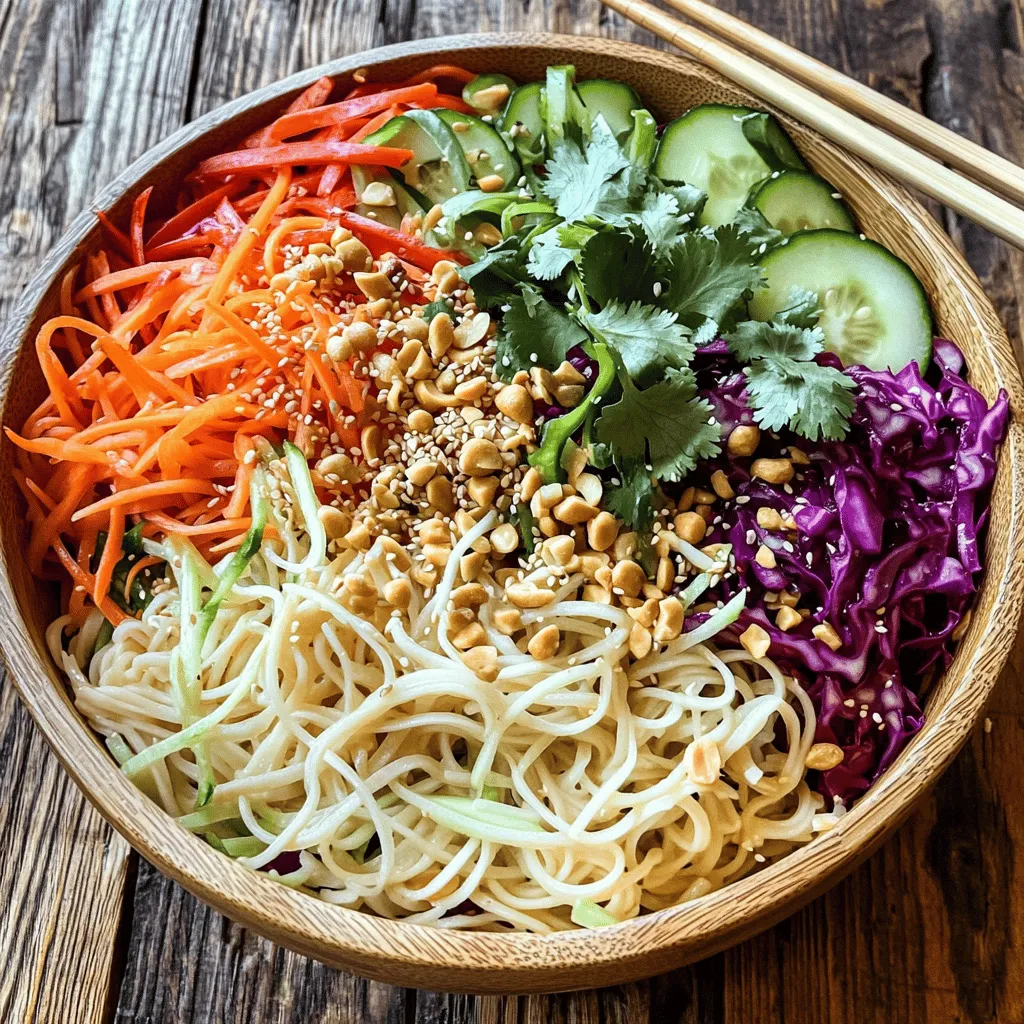 ![- 230 g Reisnudeln - 240 ml fein geraspelte Karotten - 240 ml Rotkohl, dünn geschnitten - 1 Gurke, julienne geschnitten - 1 rote Paprika, in Scheiben geschnitten - 3 Frühlingszwiebeln, gehackt - 60 ml Koriander, gehackt - 60 ml Sesamsamen (geröstet) - 60 ml geröstete Erdnüsse (gehackt) Diese frischen Zutaten sind das Herzstück des Salats. Reisnudeln sind leicht und füllen gut. Sie bieten die perfekte Basis für den Salat. Die bunten Gemüsesorten bringen nicht nur Geschmack, sondern auch Farbe auf den Teller. Karotten geben Süße, während Rotkohl knackig und gesund ist. Gurken sorgen für Frische und Paprika fügt einen süßen Biss hinzu. Frühlingszwiebeln geben einen sanften Zwiebelgeschmack. Sesamsamen und Erdnüsse bringen einen nussigen Crunch. Sie machen den Salat spannend und lecker. Jede Zutat hat ihren eigenen Charakter und trägt zur Harmonie des Gerichts bei. - 45 ml Sesamöl - 30 ml Sojasauce (mit wenig Natrium) - 15 ml frisch geriebener Ingwer - 15 ml Honig oder Ahornsirup - 15 ml Limettensaft - Salz und Pfeffer nach Geschmack Das Dressing ist einfach und lecker. Sesamöl bringt einen tollen Geschmack. Sojasauce fügt Tiefe hinzu und macht das Ganze würzig. Frisch geriebener Ingwer gibt einen warmen, scharfen Kick. Honig oder Ahornsirup sorgen für die süße Note. Limettensaft frischt alles auf und bringt Säure. Mit Salz und Pfeffer passen wir die Aromen an. Die Kombination dieser Zutaten macht den Salat besonders. Wenn Sie alle Zutaten zusammenbringen, entsteht ein tolles Geschmackserlebnis. Probieren Sie das Rezept für einen leckeren Genuss! Kochen Sie die Reisnudeln gemäß den Anweisungen auf der Verpackung. Achten Sie darauf, die Nudeln nicht zu lange zu kochen. Sie sollten weich, aber nicht matschig sein. Nach dem Kochen lassen Sie sie abtropfen. Spülen Sie die Nudeln dann unter kaltem Wasser ab. Dies stoppt den Garprozess und hilft, sie zusammenzukleben. Beiseite stellen und etwas abkühlen lassen. Jetzt kommt der Spaß! Nehmen Sie die Karotten und raspeln Sie sie fein. Schneiden Sie den Rotkohl in dünne Streifen. Für die Gurke, schneiden Sie sie in feine Julienne-Streifen. Die rote Paprika in dünne Scheiben schneiden. Hacken Sie die Frühlingszwiebeln fein. Kombinieren Sie alle Gemüse in einer großen Schüssel. Mischen Sie sie vorsichtig, damit die Farben und Texturen gut verteilt sind. In einer kleinen Schüssel mischen Sie das Sesamöl, die Sojasauce, den frisch geriebenen Ingwer, den Honig oder Ahornsirup und den Limettensaft. Rühren Sie alles gut um. Probieren Sie das Dressing und fügen Sie Salz und Pfeffer nach Geschmack hinzu. Das Dressing sollte eine schöne Balance zwischen süß, salzig und sauer haben. Fügen Sie die gekochten Reisnudeln zu Ihrer großen Schüssel mit dem Gemüse hinzu. Gießen Sie das Dressing gleichmäßig darüber. Werfen Sie alles vorsichtig zusammen, bis die Nudeln und das Gemüse gut bedeckt sind. Streuen Sie die gerösteten Sesamsamen und die gehackten Erdnüsse darüber. Mischen Sie nochmals vorsichtig, damit sie gleichmäßig verteilt sind. Servieren Sie den Salat frisch oder lassen Sie ihn für 15-30 Minuten im Kühlschrank ziehen. Die Aromen kommen so noch besser zur Geltung. Für das vollständige Rezept schauen Sie in die [Full Recipe]. Um die Reisnudeln perfekt zuzubereiten, kochen Sie sie gemäß den Anweisungen auf der Verpackung. Nach dem Kochen gießen Sie die Nudeln ab und spülen sie unter kaltem Wasser. Dies stoppt den Garprozess und sorgt für eine angenehme Textur. Achten Sie darauf, die Nudeln nicht zu lange zu kochen. Sie sollten weich, aber nicht matschig sein. Verwenden Sie frische Zutaten für den besten Geschmack. Frisch geraspelte Karotten und knackiger Rotkohl machen einen großen Unterschied. Achten Sie darauf, alles gleichmäßig zu schneiden. So hat jeder Bissen die richtige Mischung aus Texturen. Servieren Sie den Salat in einer großen Schüssel. Garnieren Sie ihn mit zusätzlichen Sesamsamen und gehacktem Koriander. Das sieht toll aus und bringt mehr Geschmack. Verwenden Sie Essstäbchen, um den Salat zu essen. Das schafft ein authentisches asiatisches Erlebnis. Es macht das Essen auch unterhaltsamer! Lassen Sie den Salat für 15 bis 30 Minuten im Kühlschrank. Dadurch ziehen die Aromen richtig durch. So schmeckt jeder Bissen noch besser. Wenn Sie den Geschmack noch verstärken möchten, fügen Sie mehr Ingwer oder eine Prise Chili hinzu. Auch ein Spritzer Limettensaft kann helfen. Experimentieren Sie, um Ihre perfekte Mischung zu finden. Für die vollständige Rezeptanleitung, schauen Sie sich das [Full Recipe](#) an. {{image_4}} Wenn du den Salat vegan machen möchtest, ersetze den Honig einfach durch Agavendicksaft. Agavendicksaft hat einen süßen, milden Geschmack und passt gut zum Dressing. Du kannst auch andere pflanzliche Zutaten hinzufügen. Denke an Avocado, Edamame oder sogar frische Mangostücke. Diese Zutaten bringen Farbe und Nährstoffe in deinen Salat. Um deinen Salat sättigender zu machen, kannst du Tofu oder Hühnchen integrieren. Wenn du Tofu verwendest, schneide ihn in Würfel und brate ihn an. Das gibt ihm eine schöne Textur. Für Hühnchen, koche es zuerst und schneide es dann in kleine Stücke. Stelle sicher, dass das Fleisch gut gewürzt ist, um die Aromen zu verstärken. Du kannst verschiedene Nudelarten verwenden, um Abwechslung zu schaffen. Reisnudeln sind leicht, aber du kannst auch Buchweizennudeln oder sogar Vollkornnudeln ausprobieren. Diese Alternativen bringen unterschiedliche Texturen und Geschmäcker. Wenn du Pasta-Optionen magst, probiere Fusilli oder Penne. Diese Formen halten das Dressing gut und machen den Salat noch interessanter. Um den Sesam-Ingwer-Nudel-Salat frisch zu halten, wähle einen luftdichten Behälter. So bleibt der Salat bis zu drei Tage lang gut. Achte darauf, das Gemüse nicht zu zerdrücken. Wenn du die Zutaten getrennt aufbewahrst, bleibt alles knackig. Frisches Gemüse ist wichtig. Überprüfe die Karotten und den Kohl. 