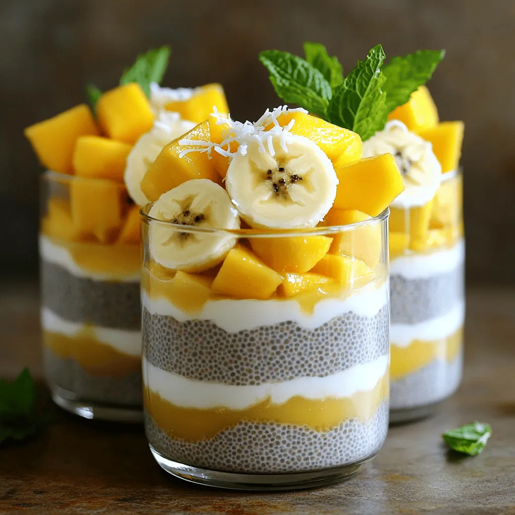 ![- Chiasamen: Vorteile und Nährwerte Chiasamen sind kleine Kraftpakete. Sie sind reich an Ballaststoffen und Omega-3-Fettsäuren. Diese Samen fördern die Verdauung und unterstützen das Herz. Eine Portion enthält auch Proteine, die helfen, den Hunger zu stillen. Chiasamen können viel Flüssigkeit aufnehmen und machen den Pudding schön cremig. - Pflanzliche Milchoptionen Für diesen Pudding empfehle ich Kokosmilch. Sie gibt einen tollen Geschmack und ist cremig. Du kannst aber auch Mandel- oder Hafermilch verwenden. Diese Optionen sind leicht und gesund. Wähle die Milch, die dir am besten schmeckt. - Süßungsmittel: Honig vs. Ahornsirup Du kannst Honig oder Ahornsirup nutzen, um den Pudding zu süßen. Honig hat einen kräftigen Geschmack, während Ahornsirup milder ist. Beide sind gute Optionen. Probiere aus, was dir besser gefällt. Achte darauf, die Menge nach deinem Geschmack anzupassen. Das Rezept nutzt 2 Esslöffel, was ideal ist, aber du kannst es ändern. Die Zutaten für Tropical Fruit Chia Pudding sind einfach, aber voller Geschmack. Wenn du mehr über die Zubereitung erfahren möchtest, schau dir das [Full Recipe] an. - Mischung der Zutaten: Beginne mit einer großen Schüssel. Gib die Chiasamen, Kokosmilch, Honig oder Ahornsirup und Vanilleextrakt hinein. Rühre alles gut um. So verteilen sich die Chiasamen gleichmäßig in der Mischung. - Abkühlen und Quellzeit: Lass die Mischung etwa 10 Minuten stehen. Rühre erneut um, um Klumpen zu vermeiden. Decke die Schüssel ab und stelle sie für mindestens 4 Stunden in den Kühlschrank. So nehmen die Chiasamen die Flüssigkeit auf und werden dick. - Konsistenz nach dem Kühlen: Nach der Kühlzeit ist der Chia-Pudding bereit. Rühre ihn kräftig um. Er sollte nun dick und cremig sein, ideal für das Schichten. - Schichten von Früchten und Pudding: Nimm Gläser oder Schalen. Beginne mit einer Schicht Chia-Pudding, gefolgt von Bananenscheiben. Dann kommt eine Schicht Mango und Ananas. Wiederhole die Schichten nach Belieben. - Dekorationstipps: Bestreue den Pudding mit ungesüßten Kokosraspeln. Garniere ihn mit frischen Minzblättern. So erhält dein Dessert einen frischen und bunten Look. Für die vollständige Anleitung, schau dir das Full Recipe an. - Zu wenig Quellzeit: Es ist wichtig, den Chia-Pudding lange genug quellen zu lassen. Wenn Sie nicht genügend Zeit einplanen, wird der Pudding nicht die richtige Konsistenz erreichen. Ich empfehle mindestens vier Stunden oder über Nacht im Kühlschrank. - Ungleichmäßiges Mischen: Achten Sie darauf, die Zutaten gut zu vermischen. Wenn die Chiasamen nicht gleichmäßig verteilt sind, können sie verklumpen. Rühren Sie die Mischung nach 10 Minuten erneut um, um sicherzustellen, dass alles gut verteilt ist. - Verwendung von Gewürzen oder Extrakten: Sie können den Geschmack Ihres Puddings mit Gewürzen wie Zimt oder Muskatnuss verbessern. Ein Hauch von gemahlenem Ingwer gibt ihm eine besondere Note. Vanilleextrakt ist auch eine tolle Ergänzung. - Optimierung der Süße: Passen Sie die Süße an Ihren Geschmack an. Sie können mehr Honig oder Ahornsirup hinzufügen, wenn Sie es süßer mögen. Alternativ können Sie auch frische Früchte nutzen, um natürliche Süße zu erhalten. Diese Tipps helfen dabei, Ihren Tropical Fruit Chia Pudding noch besser zu machen. Für das komplette Rezept schauen Sie sich die [Full Recipe] an. {{image_4}} Du kannst viele verschiedene Tropenfrüchte in deinem Chia-Pudding verwenden. Mangos und Ananas sind ein guter Start. Du kannst auch Passionsfrucht, Papaya oder Kiwi hinzufügen. Diese Früchte bringen frische und süße Aromen in dein Dessert. Wenn du eine vegane oder glutenfreie Option suchst, ist der Pudding perfekt. Alle Zutaten sind pflanzlich. Verwende einfach Agavendicksaft anstelle von Honig. Das macht es süß und lecker. Glutenfreie Menschen können die gleiche Rezeptur genießen. An besonderen Tagen kannst du deinen Chia-Pudding anpassen. Füge Essenzen wie Kokos oder Limette hinzu. Diese kleinen Details machen dein Dessert besonders. Du kannst auch die Schichten mit weiteren Zutaten variieren. Schichte den Pudding in schönen Gläsern. Beginne mit einer Schicht Chia-Pudding, gefolgt von Früchten. Das sieht nicht nur toll aus, sondern schmeckt auch großartig. Nutze frische Minze zur Dekoration. Sie macht dein Dessert lebendig und ansprechend. Für die vollständige Rezeptanleitung schaue dir die [Full Recipe] an. Wenn du deinen Chia-Pudding aufbewahren möchtest, ist der Kühlschrank der beste Ort. Der Chia-Pudding bleibt frisch und lecker. Du kannst ihn in einem luftdichten Behälter aufbewahren. Damit verhinderst du, dass der Pudding Gerüche aus dem Kühlschrank aufnimmt. Die Haltbarkeit von Chia-Pudding beträgt etwa 5 bis 7 Tage. Achte darauf, dass du ihn vor dem Verzehr gut umrührst. So bleibt die Konsistenz gleichmäßig. Wenn du siehst, dass der Pudding Wassertropfen bildet, ist das normal. Diese entstehen, wenn die Chiasamen Flüssigkeit abgeben. Meal Prep ist eine tolle Möglichkeit, Zeit zu sparen. Du kannst deinen Chia-Pudding für die Woche vorbereiten. Teile ihn in Portionen auf und lagere sie in kleinen Behältern. So hast du immer einen gesunden Snack zur Hand. Wenn du noch länger planen möchtest, kannst du den Pudding auch einfrieren. Fülle ihn in gefriergeeignete Behälter. Lass etwas Platz, damit der Pudding sich ausdehnen kann. Zum Auftauen stelle den Pudding einfach über Nacht in den Kühlschrank. So bleibt er frisch und schmackhaft. Für das vollständige Rezept schau dir bitte die [Full Recipe] an. Chia-Pudding bleibt frisch für etwa 5 bis 7 Tage im Kühlschrank. Es ist wichtig, ihn in einem luftdichten Behälter aufzubewahren. So bleibt er kühl und lecker. Überprüfen Sie ihn vor dem Essen. Wenn er seltsam riecht oder aussieht, werfen Sie ihn lieber weg. Ja, Sie können Chiasamen auch mit Wasser verwenden. Es wird jedoch die Konsistenz und den Geschmack ändern. Wasser macht den Pudding dünner und w
